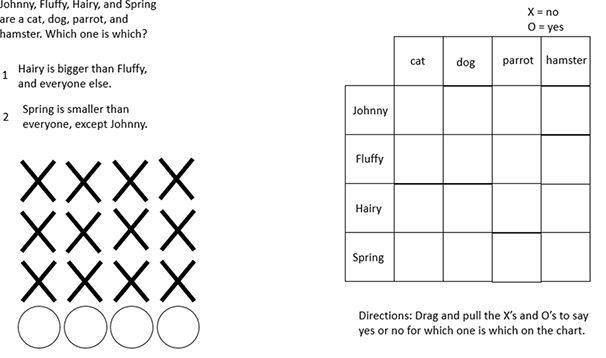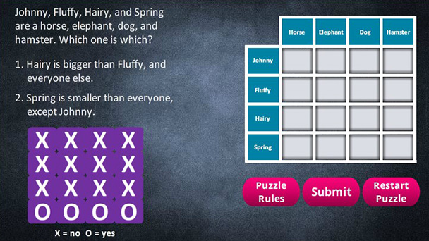 Regarding the size of the animals in the puzzle, some catsare bigger than some dogs. Also, parrots are larger than cats when consideringtheir wingspan. So, if we wanted to have an absolute correct answer for eachoption, we needed to select animals in our puzzle that absolutely followed aparticular size order. Therefore, we changed the size order to elephant, horse,dog, and hamster. And for added difficulty, Donovan wanted to mix up the sizeorder in the chart.