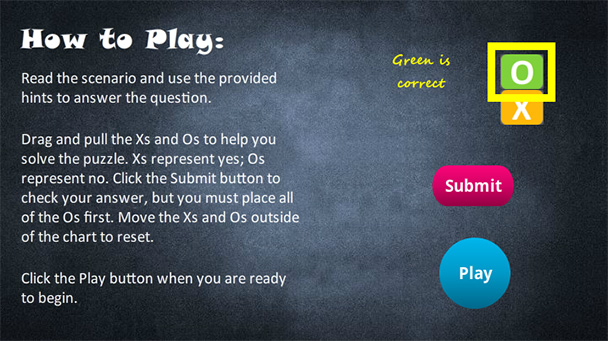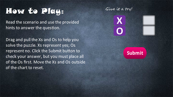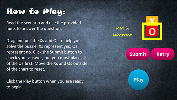 Constant feedback is a must, and this logic puzzle utilizesmultiple states to cue learners when their interactions are complete. Thenormal state on the Xs and Os is purple; however, when either one is dropped ona drop target in the chart, it changes states to “placed,” which is orange.When an O is dropped on one of the correct answer drop targets, it changes to a“correct” status but maintains the orange color so the learner won’t know whetheror not the answer is correct until the submit button is clicked. (Figure 3)
