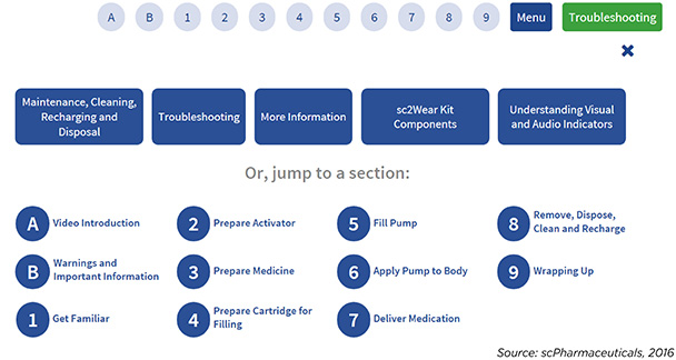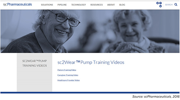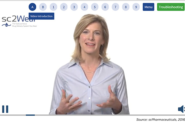 The use of interactive video is an integral part ofscPharmaceuticals’ user training program for a drug-device combination enabledby the sc2Wear pump, a proprietary patch pumpfor subcutaneous administration of drugs (Figure 1).