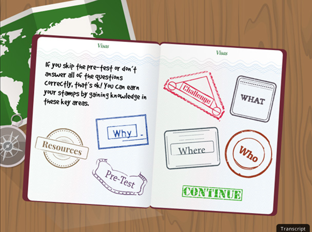 The course, an eLearning course that can be completed inabout 30 minutes, is based on a travel theme, and learners receive “stamps” ina virtual “passport” as they complete sections. The sections build on oneanother, so learners get basic information first, then work through scenarioswhere they apply what they’ve learned.