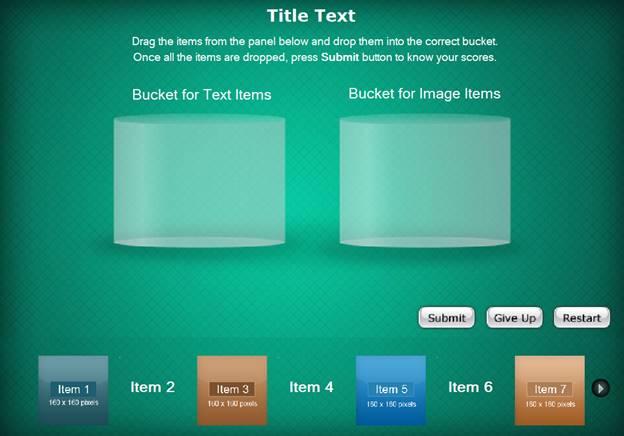 Another popular Raptivity interaction is called Drag DropSort. Its template can be seen in Figure 7. Two flavors of the same templatecan be seen in Figure 8. They look quite different, yet they are based on thesame template.