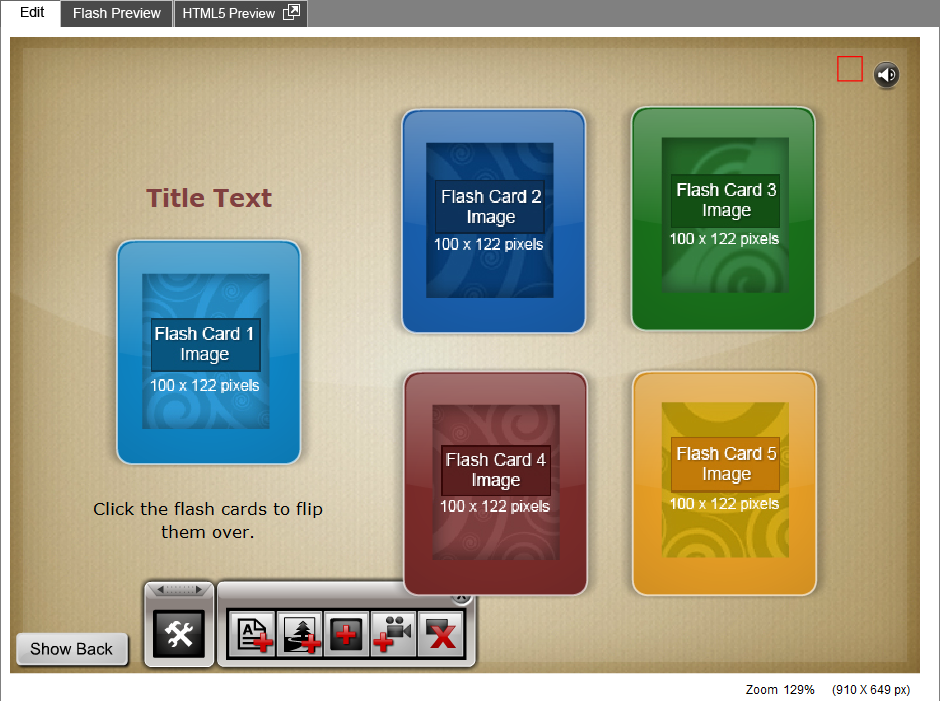 Figure 3:The Flash Card interaction. Notice the toolbox, from which you can addtext, images, buttons, and videos.