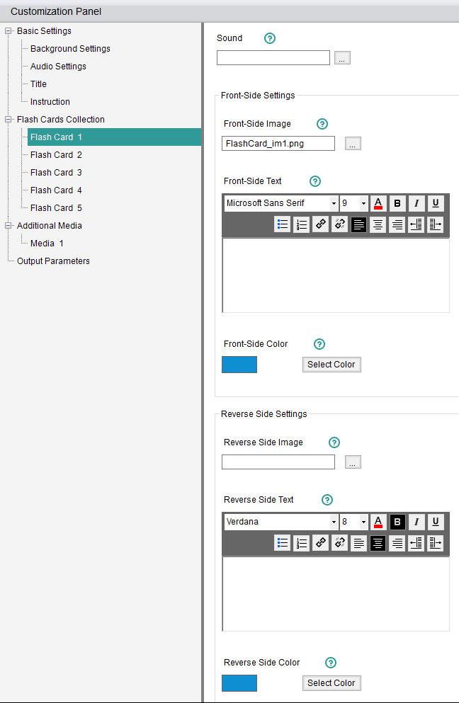 Figure 4: The Customization Panel for the Flash Cardinteraction. This is showing just the options for Flash Card 1. Notice all theother categories on the left for further customizable areas.