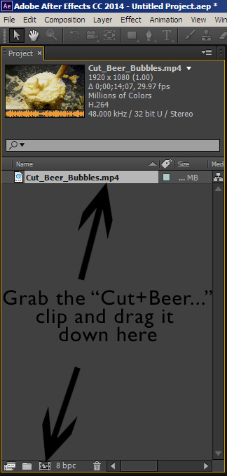 NOTE: Here is the video clip I used,if you want to practice on that. - As you drag the little video clip down to theicon, it will create a new composition the length and dimensions of the videoclip. There are easy ways to trim the clip here, but I’ve found that if you trimand export the clip from Premiere Pro before importing into AE, things go muchsmoother.
