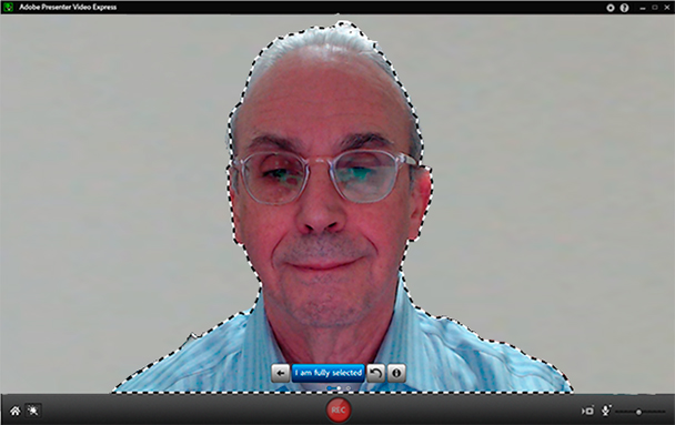 This selection is a bit of prestidigitation that uses a verycomplex new algorithm. The program first takes a still image from my camera.Then it uses that image to “extract” me from the background. Then iteffectively allows me to record my video (in this case it would be a talkinghead, but it doesn’t have to be) while I’m doing standard human movements andmotions. And it keeps me separated from the background the entire time I’mrecording.
