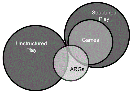 Games in general must contain attainable goals, rules, consequences, and competition. The majority of team-based games contain structured play (play with rules and goals). ARGs, unlike many other game types, can merge structured play and unstructured play (play devoid of rules or goals). Elements may be evident in ARGs when players interact spontaneously to determine roles, tactics, and/or actions to take. Hence, players have the ability to help drive the game, build its ultimate structure, plot, and assets, and even dictate and recruit participants.