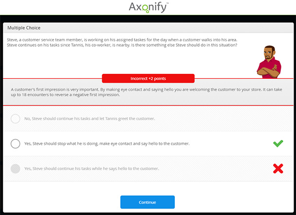 Figure 2: Each learner’sdigital Axonify coach provides explanations for both correct and incorrectanswers. Even incorrect answers award some points, helping to relieve testanxiety, and emphasize that questions are opportunities for learning.