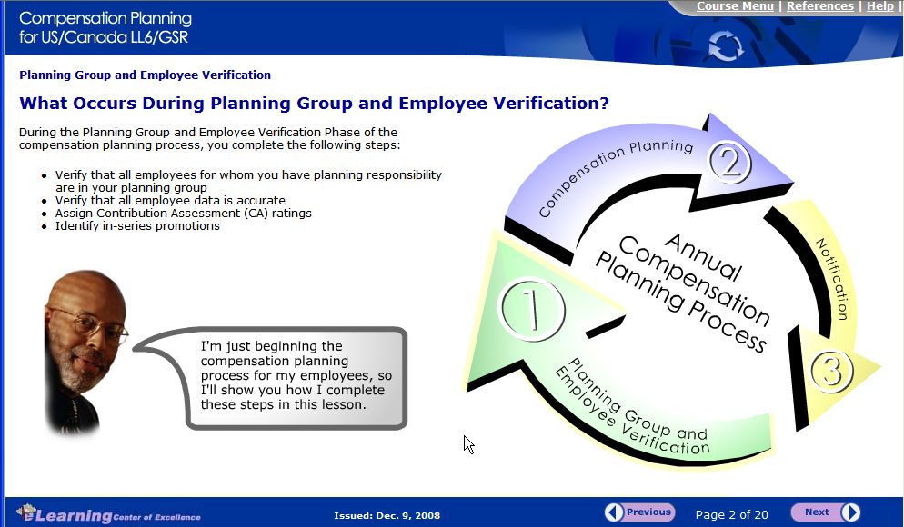 The e-Learning village had not heard the “fluff” term before, and needed to discover its meaning. We learned that our head SME from the Finance kingdom had recently taken one of the e-Learning village’s Web-based training courses, “Compensation Planning,” which was also PeopleSoft training, but for the Human Resources application. In this course, we used a standard linear Web-based training template that included the following content: