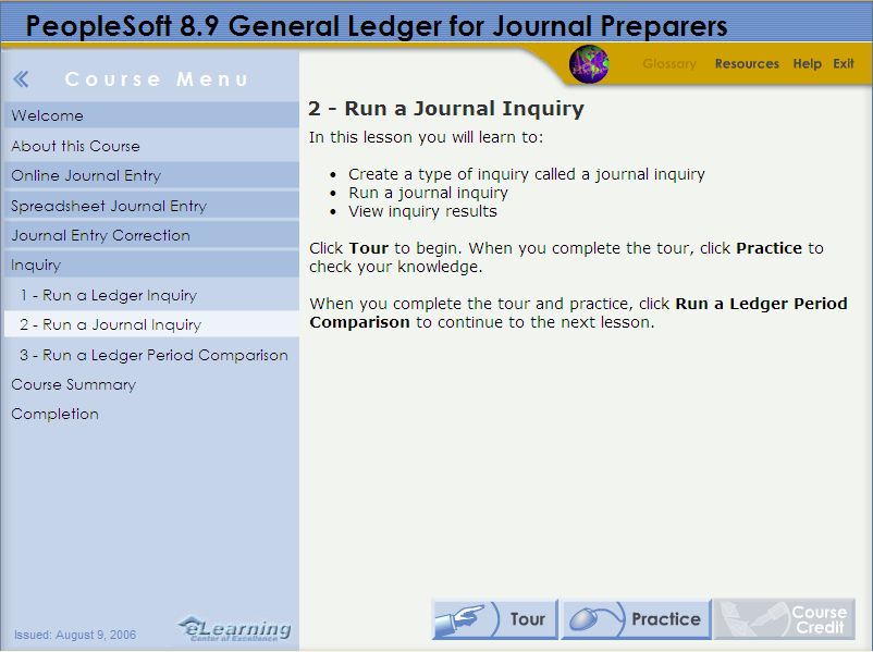 The e-Learning villagers put together a new course shell that simply stated the following outline-type structure: Course title, Module title, Lesson title. (See Figure 2.) Each lesson covered a specific application task, and each module was a logical grouping of tasks. The shell differed from our traditional courses in that we removed all of the “fluff.” Including a course menu on the left panel, each course, module, and lesson was given only one page (right panel) on which to write learning objectives and from which to launch both a guided simulation (called a Tour) and a practice simulation (called a Practice). The course was no longer the traditional linear WBT. The learner could move around the new shell in a linear fashion (suitable for new users) or in a non-linear fashion based on locating a task of interest. The shell was built with Adobe Flash and was XML driven, which increased its flexibility and simplicity.