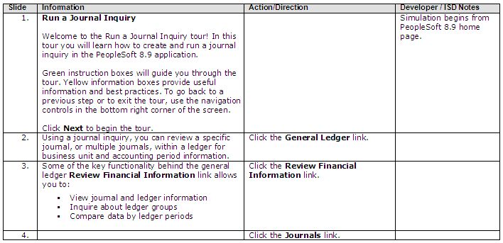 The current process included a phase during which the ISD created storyboards. We decided that a storyboard was useful to represent the learning objectives for the new shell, but a traditional storyboard would not help us to communicate the simulation content. We needed something else, and created a simulation script to include all of the simulation content with action steps to complete a defined task. (See Figure 3.)