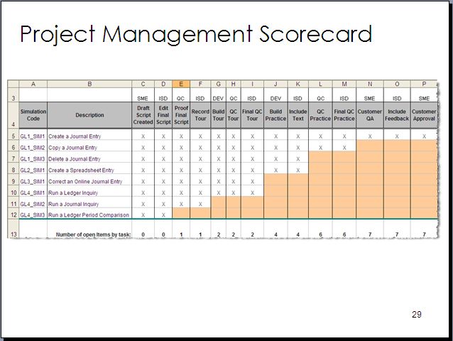 In addition to using templates to communicate with the Finance kingdom and other members of the e-Learning village, we incorporated two more communication vehicles. For example, we used Microsoft SharePoint to share documents for viewing and editing purposes. We used Microsoft Excel to build a “project management scorecard” in order to keep track of which team member had current responsibility for a simulation at any given time. (See Figure 7.) We did this because each simulation changed hands many times throughout the creation and development process.