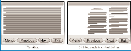 Eyes glaze over when they see large blocks of text, and learners are likely to exercise every option you give them to skip past the text. Figure 5 demonstrates a terrible layout and an improvement.