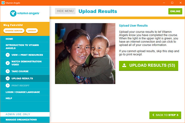 A single USB device can store data for several towns—dozensor even hundreds of users—uploading the data at the earliest opportunity to anLRS (learning record store) that Vitamin Angels maintains to ensure that allits partner health care workers have up-to-date training. Any time the USB isinserted into a connected computer, the program asks the user whether she wantsto upload the records.