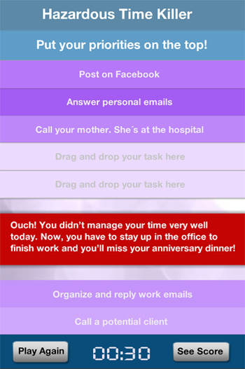 Somemonths ago, I designed a game-based experience that I named “Hazardous TimeKiller” for one of my clients. They needed to help the company´s staff managetime and work overload more effectively and they were curious about the applicationof game design principles to this specific training. I will share with you theinitial mockups to illustrate some of the key ingredients of a successfulgame-based learning experience.