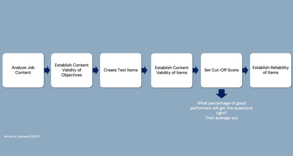 Use your task analysis to determine the best assessment approach. Shrock and Coscarelli’s Criterion-Referenced Test Development emphasizes testing learners based on their individual performance of the skills, not on how they compare to others.