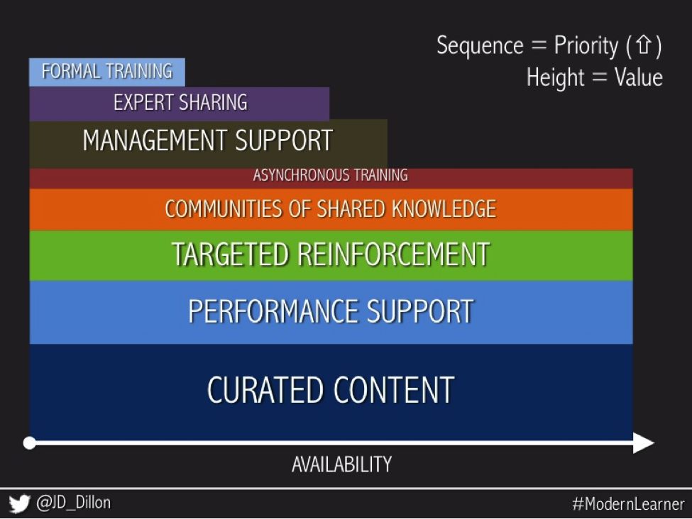Then we lost our primary eLearning developer. I stepped in to finish his Captivate work. When I went hunting for source material on the company intranet, I couldn’t find anything. I figured I just didn’t know where to look because I was new, so I asked around. No one could find anything. Not only that, but I noticed how many training requests seemed related to missing reference information. In this moment, I recognized that the foundation of workplace learning was shared knowledge—not training. The ability to quickly solve problems that arise in the moment, not go to a class or click through an eLearning.