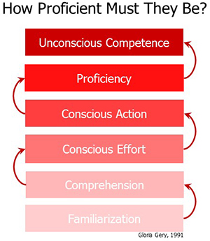 JM: Yes. And that’s OK. If that’sthe goal, then that’s OK. Gloria Gery had a wonderful chart [Figure 1] that sheused in her talks about how well you want the learner to know the knowledge. [Editor’s note: This chart began life as“The Four Stages for Learning Any New Skill.” It originated with Noel Burch, anemployee of Gordon Training International, in the 1970s. Gery and many otherspeakers and trainers have used it extensively over the years.] It startswith familiarity and goes up to unconscious competence. I need a person who’staking EMT training to be unconsciously competent with CPR. I need them to walkin and go. If I’m training an elementary school teacher on CPR, she might needto know it, but she can take action by thinking through the steps. She doesn’tneed to be unconsciously competent, so I don’t need to drive her to that point.I need her to know enough that, in the event something happens, she can take action.But the likelihood of her needing to take action doesn’t require her to beunconsciously competent. So we need to know how well we want them to learn.