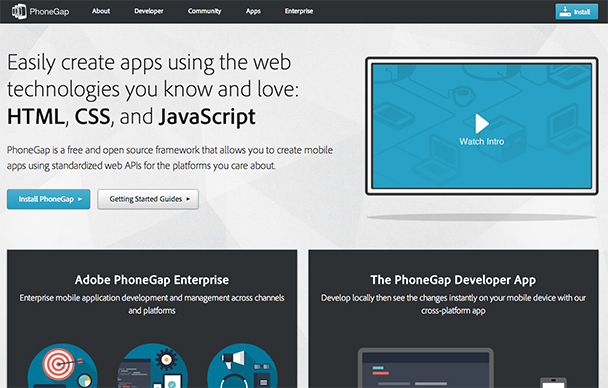The PhoneGap website. The install button appears on the upper right. Youmay wish to view the helpful intro video provided on the page.