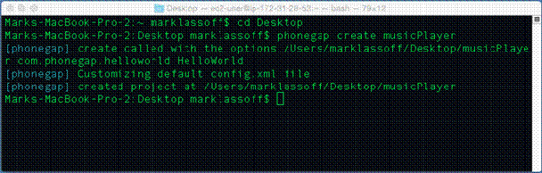 1. With PhoneGap installed, we’ll now create the PhoneGap templateapp. When you create a new PhoneGap application, a template app is installed byPhoneGap. This template is essentially a placeholder and most of it can beremoved. To create the PhoneGap app, make sure your command line is pointed atthe location where you want to save the app. I used the desktop (see Figure 3).(You can use the cd command on thecommand line to change directories on Mac and PC). Issue the following commandto create the PhoneGap template app: