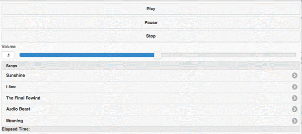 <script>            var player;            var rngVolume;            var intv;                        window.onload = function()            {                init();                //document.addEventListener('deviceready', init, false);            }                        function init()            {                   player = document.getElementById('player');                var btnPlay = document.getElementById('btnPlay');                var btnStop = document.getElementById('btnStop');                var btnPause = document.getElementById('btnPause');                rngVolume = document.getElementById('rngVolume');                               btnPlay.addEventListener('click', playMusic, false);                btnStop.addEventListener('click', stopMusic, false);                btnPause.addEventListener('click', pauseMusic, false);                         }                        function changeVolume()            {                player.volume = rngVolume.value;            }                        function pauseMusic()            {                player.pause();            }                        function playMusic()            {                player.play();                startTimer();            }                        function stopMusic()            {                player.pause();                player.currentTime = 0;                stopTimer();            }                        function changeSong(song)            {                stopTimer();                player.pause();                player.src = "assets/" + song + ".mp3";                player.play();                startTimer();            }                        function startTimer()            {                intv = setInterval(updateTime, 1000);               }                        function stopTimer()            {                clearInterval(intv);            }                        function updateTime()            {                document.getElementById('timeOut').innerHTML = "Elapsed Time: " + secsToMins(player.currentTime);               }                        function secsToMins(seconds)            {                var minutes = Math.floor(seconds/60);                var theSeconds = seconds - minutes * 60;                if(theSeconds > 9){                    return minutes + ":" + Math.round(theSeconds);                } else                {                    return minutes + ":0" + Math.round(theSeconds);                }                             }        </script>