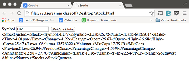 <script> var xmlhttp; window.onload=function() { xmlhttp = new XMLHttpRequest(); xmlhttp.onreadystatechange = processReturn; document.getElementById('getInfo').addEventListener('click', sendRequest, false); } function sendRequest() { url = "https://www.webservicex.net/stockquote.asmx/GetQuote?symbol="; url += document.getElementById('symbol').value xmlhttp.open("GET", url, true); xmlhttp.send(); } function processReturn() { if(xmlhttp.readyState == 4 && xmlhttp.status==200) { alert("Got it!"); } } </script>This is fairly dense code—especially if you don’t have much JavaScriptor ActionScript experience. This code, however, sends our request to the serverfor data. You can test it by loading it into your browser and requesting astock symbol such as LUV. When you press the “Get Stock Info” button, it willcontact the server. The remote server is going to prepare and send the databack to our program—however we won’t be able to see it just yet.