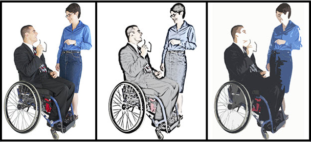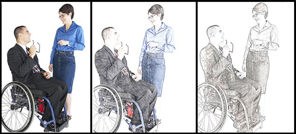 Sometimes I have a different problem, like needing to mix imageswith different styles or from different libraries. Or I have a number of imagesfrom disparate sources or of varying quality and need them to have a unifiedfeel. Or I need to take a custom photo but want to obscure identities, as myaudience can find images of coworkers in training materials distracting or havinglimited credibility. Or I need to compensate for a problem with color or tintor exposure. There are so many free or inexpensive tools for helping with thiskind of thing now. For instance, the two images at right in Figure 3 werecreated with a free iPhone photo app from the original photo at far left.