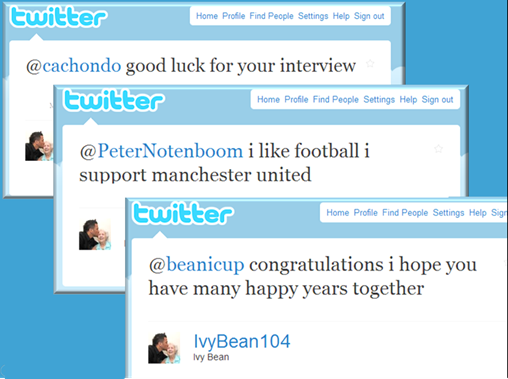 Sadly, we’ve lost my first celebrity follower, but who remembers when British nursing home resident @Ivybean104 had her 105th birthday and reminded us all on Twitter to be careful choosing your Twitter handle, because she didn’t want to change hers to @IvyBean105? She interacted with people around the world, making real connections with others, talking about sports and job interviews and weddings (see Figure 1 for examples).