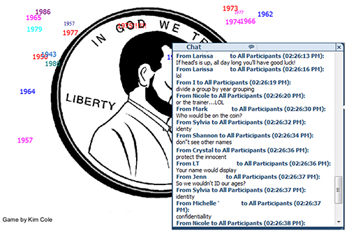 Figure 1 is from a train-the-trainer class. The facilitatordisplayed this penny image and asked participants to write their birth years onit. The virtual classroom tools allow this to be done anonymously, as you can see.Participants were asked to discuss reasons for anonymity in some classactivities, a feature unique to the webinar environment.
