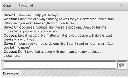 This can be especially useful for those whose work involves usingchat, such as some customer service reps. In this example, Odessa wasinstructed to be the angry caller with a broad, sweeping complaint. Dave wasthe new customer service rep tasked with identifying the problem.