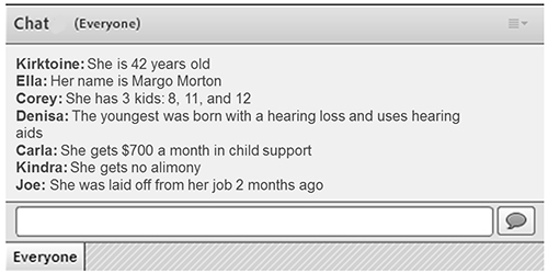 In the example in Figure 3, a group of workers who deal witheligibility for Medicaid benefits used a round-robin chat to construct a samplefamily that would be the basis for the case they would subsequently workthrough.