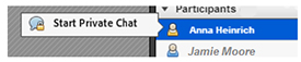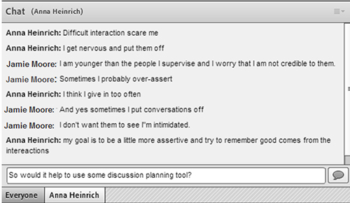 Here’s an example of a private chat from a class for newsupervisors. The facilitator has set up pairs of participants. Figure 4 showsJamie starting a private chat with Anna. Other participants cannot see thisconversation. Pairs are given five minutes to talk about their challenges with handlingdifficult discussions with employees and to develop one suggestion forimproving (Figure 5). At the end of the activity, each pair will close theprivate chat and share the suggestion with the rest of the class.