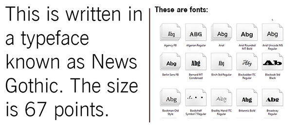 Onthe other hand, a font is a computerfile that holds the information about a typeface. You would install a font ontoyour computer so that you may display a new typeface. “Font versus typeface” isgreat family dinner conversation(Figure 5).