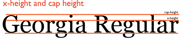 Usingthe typeface Georgia Regular as an example, the x-height of a typeface is the height of lowercase letters above thebaseline. The cap height is theheight of the tallest letters in the typeface. Both x-height and cap heightmeasurements vary from font to font.