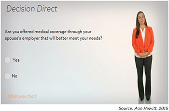 After viewing the selected videotopic, users are given links within the video to outside tools that help withadditional decision-making, such as the Aon Hewitt Decision Direct preferencemodeling tool (Figure 2).