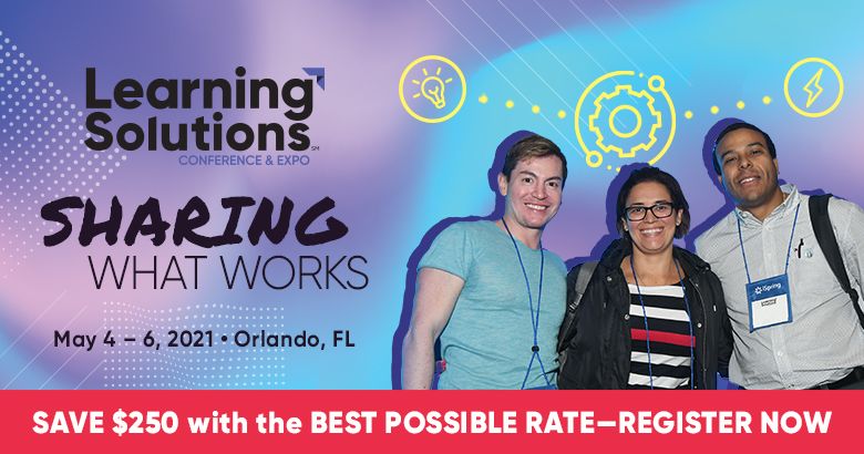 Learning Solutions 2021 Conference & Expo is the premier event for learning professionals seeking to share new ideas, inspiration, and solutions that transform the way we think about learning and development. Join us May 4 – 6, 2021, for a high-energy week of learning, connecting, and sharing what works!