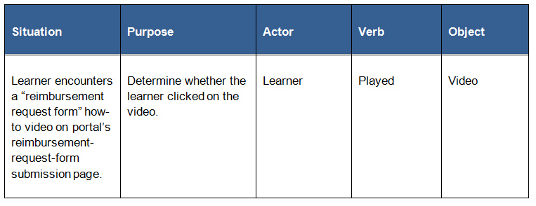 Table 1: (Example) Documenting and formatting an xAPI designThe Situation column can be used to describe the learneraction that triggers the xAPI statement. The Purpose column describes what isbeing tracked and why. The Actor, Verb, and Object columns are the threecomponents that make up an xAPI statement. This table format will document yourdesign and provide the information your web developer will need to code theJSON version of the statement, place it in the proper location, and ensure theright information is being recorded.