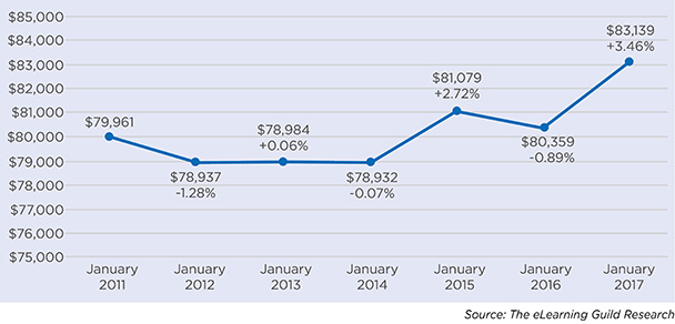 The eLearning Guild has released the 2017 eLearning Salary & Compensation Report. Based on datacollected from more than 2,600 global survey respondents, the average US basesalary of $83,139 is up 3.46% compared to the US national average of $80,359that we reported in 2016. The 2017 average annual salary for non-US respondentswas $63,103.
