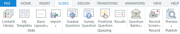 - There is no longer a New Slide option, nor aRecord Screen option, on the Insert toolbar. Rather, they are now on a newtoolbar called Slides (Figure 2), which gives you faster access to insert thetype of slide you wish. It also now includes access to Storyline’s new ContentLibrary (described below).