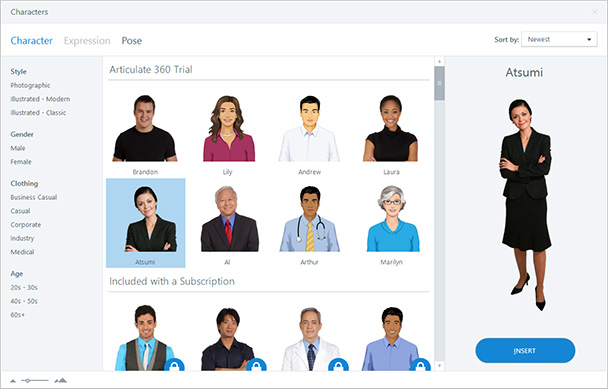 Storyline 360 has upped its selection of characters inthe new Content Library (Figure 7), now allowing you to filter the charactersyou see by style, gender, clothing, and age group. Content Library isintegrated directly with Storyline 360 to support a fast workflow. And the new,realistically illustrated “Modern” characters include built-in emotional statesfor easy trigger creation. Articulate has publicly noted that it willcontinuously add characters to Content Library.