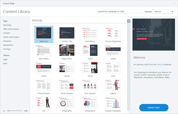 Similarly, Storyline 360 now also includes many newtemplates (Figure 8), which you can filter by type and light or dark theme. Allthe interactions included are pre-wired and ready to go, and all their elementsare tied in to font and color themes, so you customize them to your style andbrand. Templates come in both 4:3 and 16:9 aspect ratios, and Storyline 360will serve up the closest version to your project canvas.
