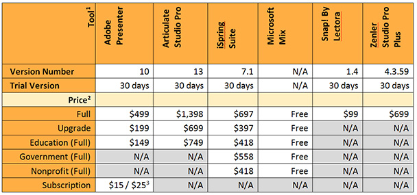 2Some products offer versions with fewerfeatures at a lower price. For instance, Zenler Studio Pro is $299 while ProPlus is $699. Articulate Studio offers a version for $999 that does not includethe Engage interactions.