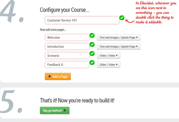 The first time you use Elucidat, helpful videos pop up to guide you inthe process of creating your course. If you ever get stuck you can choose aHelp Me button to speak to Elucidat’s support department, though it’s notlikely you’ll need to as options are pretty clear.