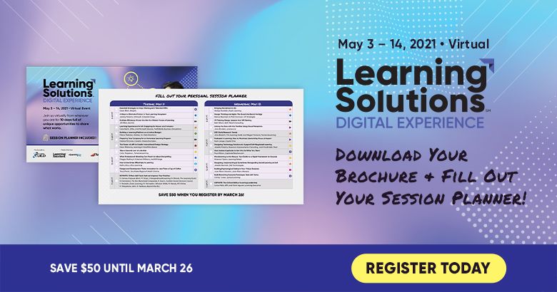 If you haven’t already heard, this year’s Learning Solutions Conference & Expo has made the shift to the virtual space. Join learning professionals from around the world on May 3 – 14 for Learning Solutions 2021 Digital Experience for 10 unforgettable days of exploring, connecting, and sharing what works in L&D today. Plus, your registration gets you access to the digital platform for six months afterward, giving you the chance to reinforce all that you learned during your two-week experience.
