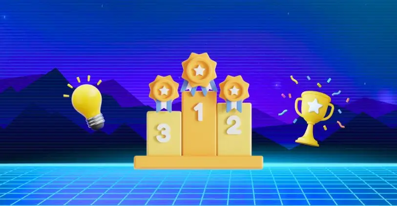 Podium with awards, light bulb, and a trophy with a mountain scape background.