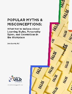 See Jane Bozarth, director of research for the Learning Guild, debunk myths and misconceptions in L&D. In this report, Popular Myths & Misconceptions: What Not to Believe About Learning Styles, Personality Types, and Generations in the Workplace, Jane revisits her earlier work on these topics and provides new insights, recent citations, and new areas of focus researchers are exploring. This report is a practical tool designed to equip you with solid evidence, rationale, and alternatives when engaging with stakeholders, management, and HR.