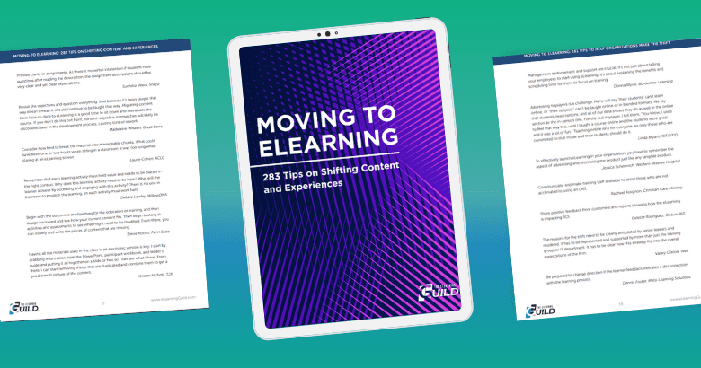 This eBook, Moving toeLearning: 283 Tips on Shifting Content and Experiences, provides tips frommembers of The eLearning Guild who’ve experienced the transition from theclassroom to eLearning themselves, with a focus on moving content andexperiences. This eBook is the second of a three-part series—part three will bereleased later this year; part one, Movingto eLearning: 154 Tips on Getting Started, was released earlier thisyear.