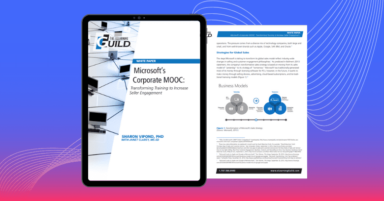 This complimentary white paper, by Sharon Vipond and Janet Clarey, describes how Microsoft designed and launched its first, highly successful MOOC at a critical juncture in the company’s history. The MOOC needed to provide essential and transformative training for the worldwide salesforce and enable sales personnel to engage with customers and sell using Microsoft’s new cloud-based and mobile-focused strategy.