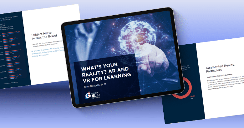 The eLearning Guild conducted a survey with its members on the topic of augmented reality and virtual reality. What’s Your Reality? AR and VR for Learning, by Jane Bozarth, explores the data collected from the survey and shares key findings. In the report, find action items on how you can get started.
